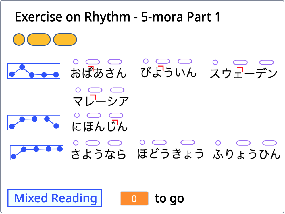 Words are grouped according to the number of moras and rhythmic patters. For example, all words in "Exercise on Rhythm - 3-mora part 1" have ta-tan rhythm. Illustrations in blue indicate the words share the same pitch accent patterns. (You will learn more about pitch accent patter in the next chapter.)