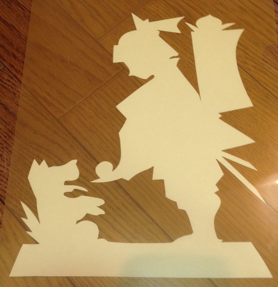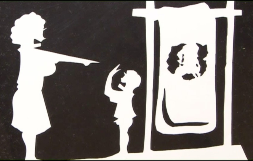 この実験では、もう一つ切り慣れている「桃太郎」を一筆書きで描いていただきました。桃太郎が犬にきびだんごを上げている場面で、桃太郎と